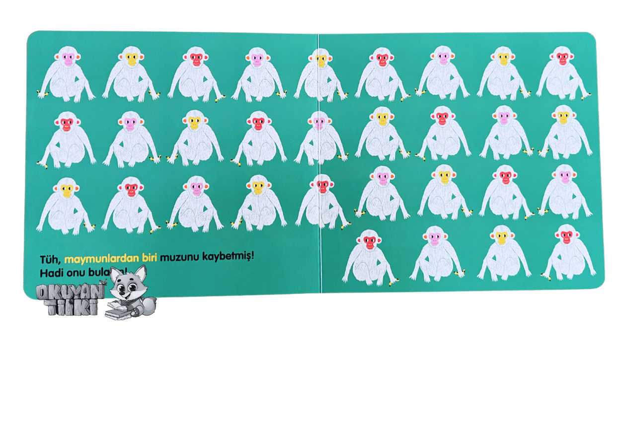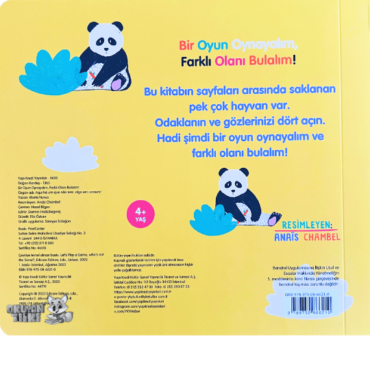 Bu kitabın sayfaları arasında saklanan pek çok hayvan var. Odaklanın ve gözlerinizi dört açın. Hadi şimdi bir oyun oynayalım ve farklı olanı bulalım!