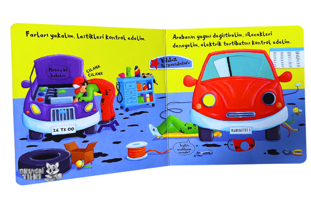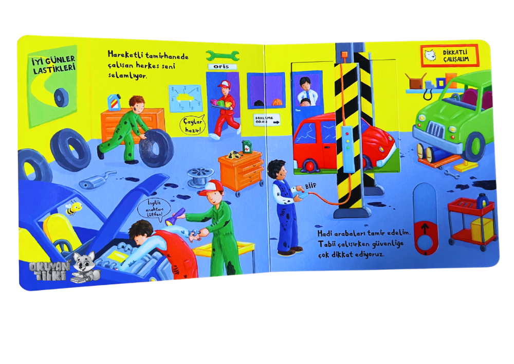 Hareketli tamirhanede çalışan herkes seni selamlıyor. Hadi arabaları tamir edelim.” Çocuğunuz parmaklarıyla karakterleri hareket ettirip, bu eğlenceli öyküye katılabilir.
