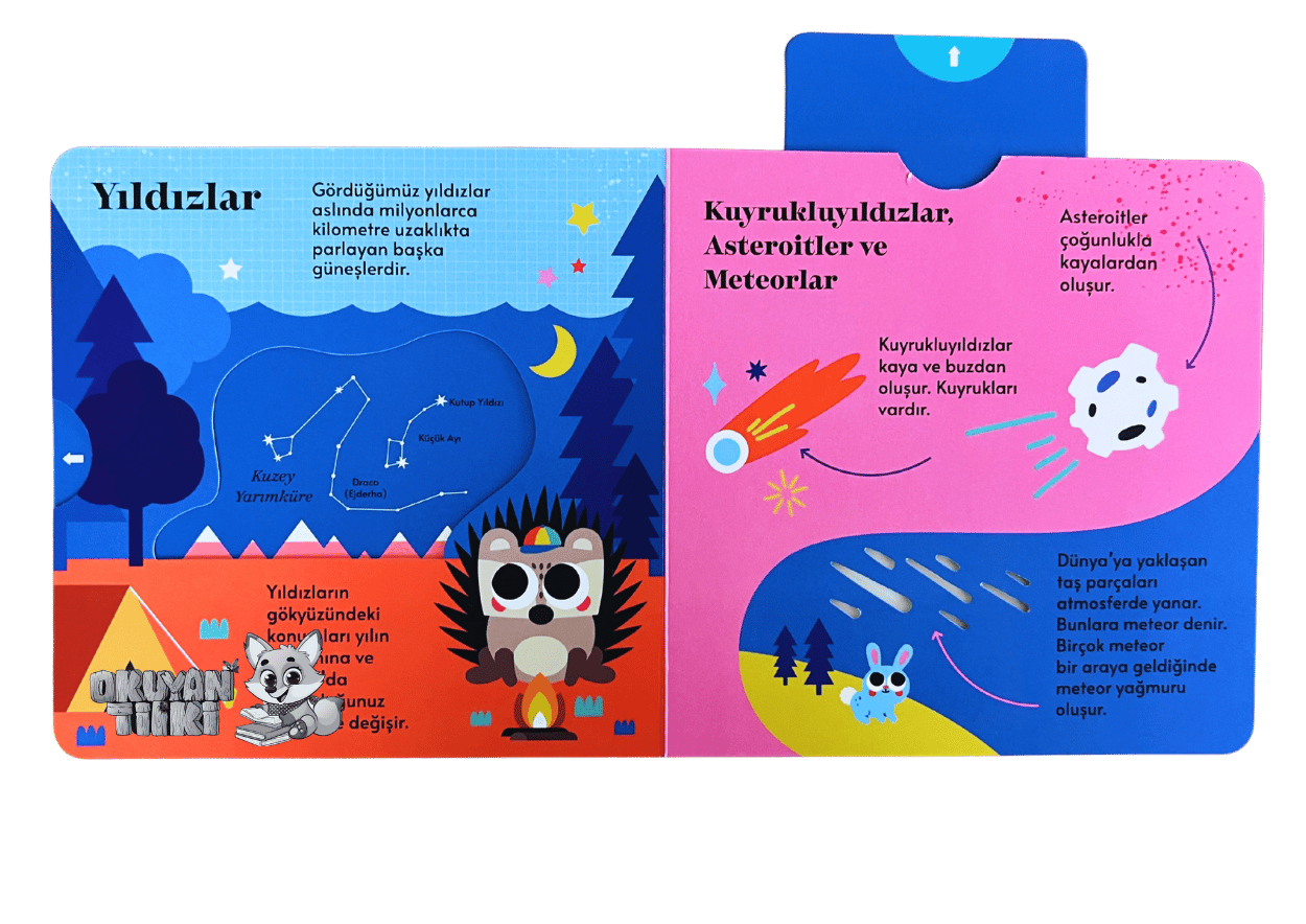 Kıpır Kıpır Hareketli Kitabım Uzay’da minik eller gezegenleri döndürüyor, meteorlar yağdırıyor. Kitabın sayfaları arasında yer alan çarklar ve hareketli parçalar sayesinde Ay hareket ediyor.