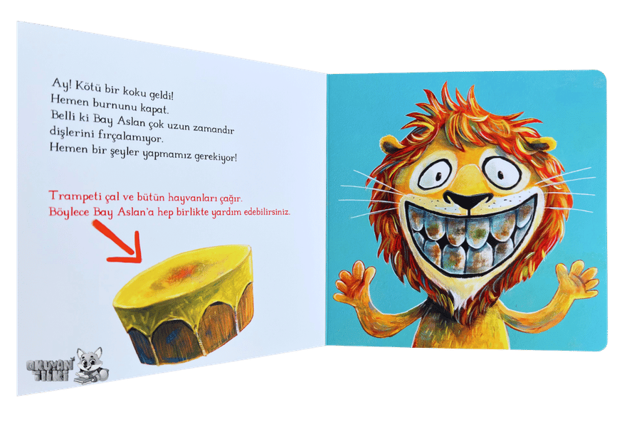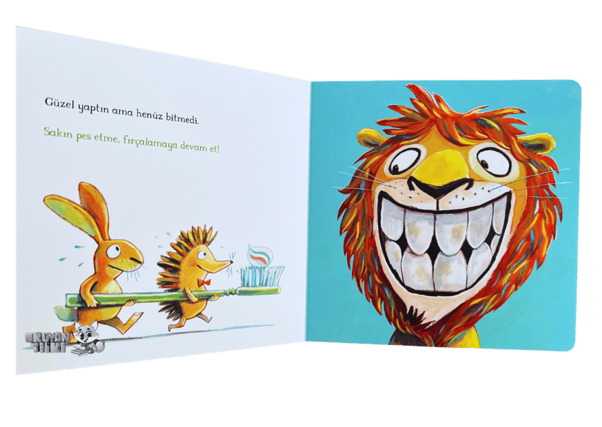 Bay Aslan’ın acilen yardıma ihtiyacı var: Kendisi çok uzun zamandır dişlerini fırçalamamış! Üstelik tek başına dişlerini fırçalayamıyor. Yardım eder misin? Kirpi Nane sana nasıl fırçalayacağını gösterecek.