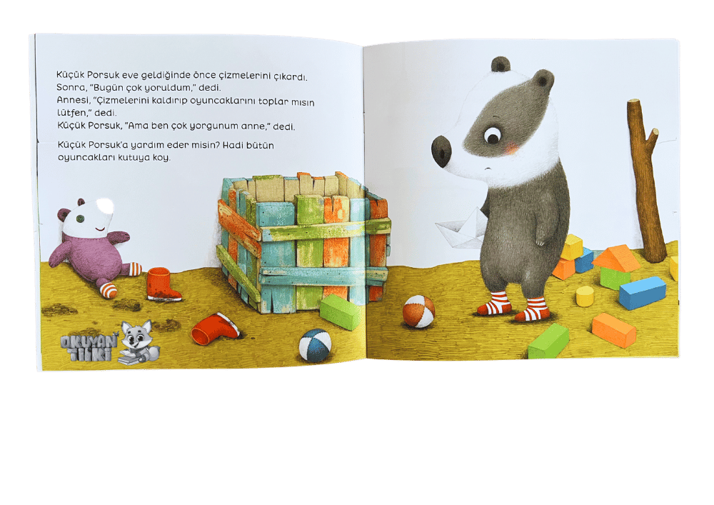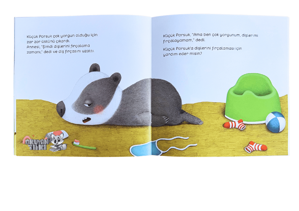 Küçük Porsuk çok yorgun olduğu için odasını toplamak, yemeğini yemek ya da dişlerini fırçalamak istemedi. Ama uyku vakti geldiğinde yorgunluğu birdenbire geçiverdi…
